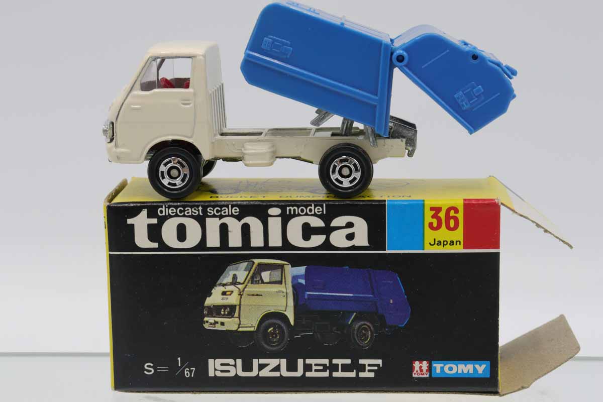 トミカ 黒箱★36★いすゞエルフ 清掃車 (白/青) ※フロントガラス少キズ・箱少スレ、少破れ・フタめくれ、爪跡・買取品・現状渡し