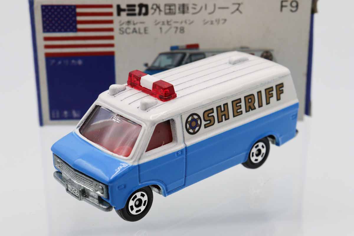 トミカ 青箱★F9★シボレーシェビーバン シェリフ (SHERIFF) ※ルーフチップ・箱スレ、少汚れ・フタめくれ・買取品・現状渡し