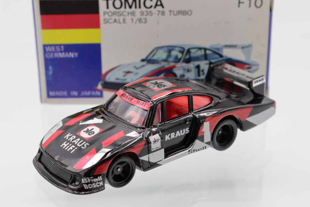 トミカ 青箱★F10★ポルシェ935-78 ターボ(黒/#1) ※箱少ヤケ、スレ、少汚れ・フタめくれ、ヨレ・貼済・買取品・現状渡し